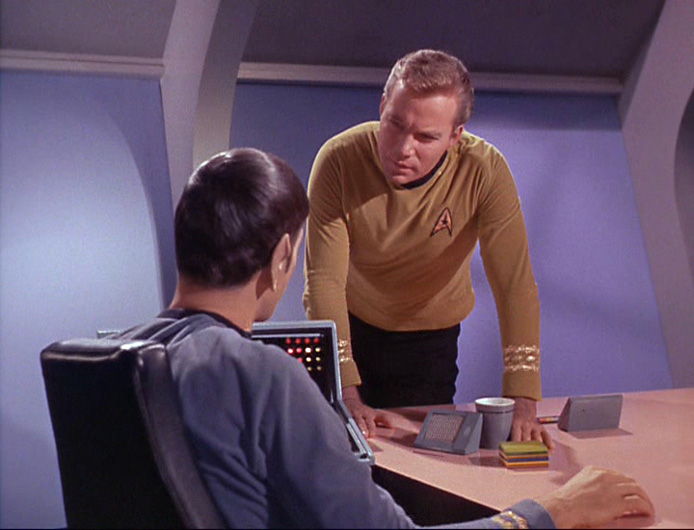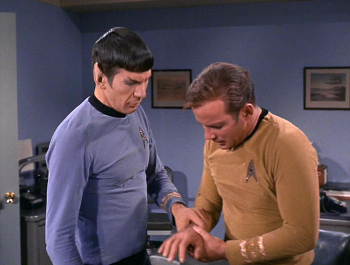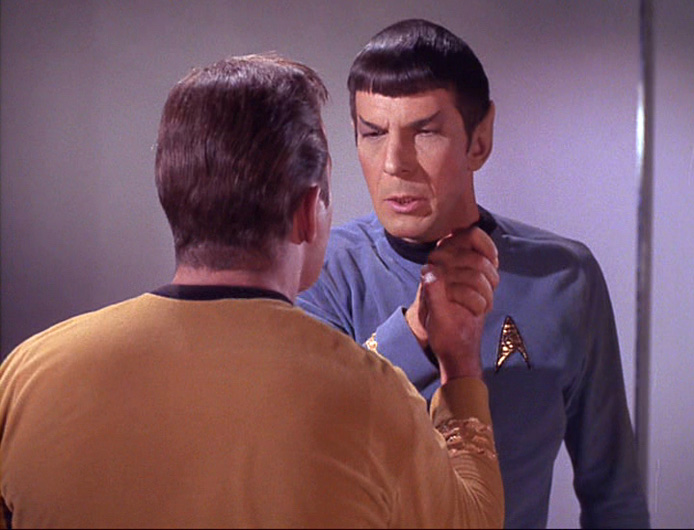 Takes place during Enemy Within. Spock is disturbed by Kirk's strange behavior, and goes to his quarters to confront him. This is either a mistake, or a very good decision, depending upon one's perspective.